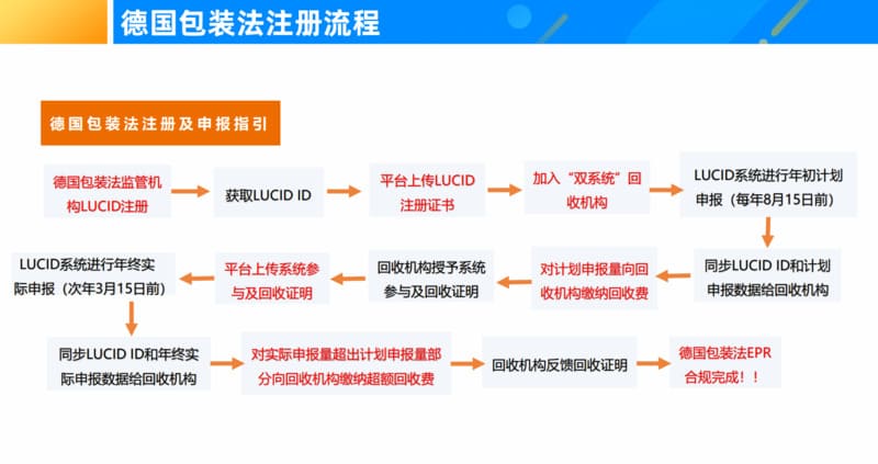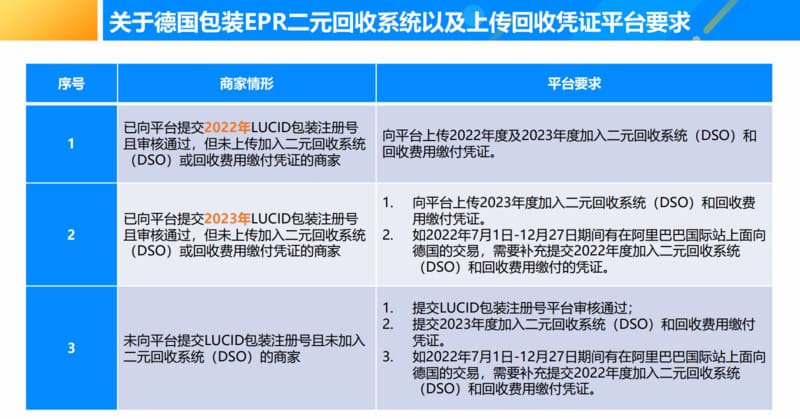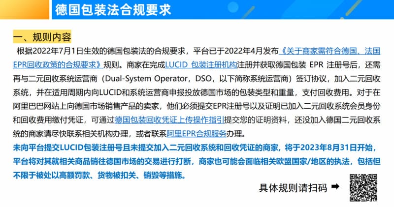 根据2022年7月1日生效的德国包装法的合规要求,平台已于2022年4月发布《关于商家需符合德国、法国规则。商家在完成LUCID 包装注册机构注册并获取德国包装,可通过德国包装回收凭证上传操作指引提交您的证明资料,还没加入德国二元回收系统的商家请尽快联系相关机构办理,或者联系阿里EPR合规服务办理。